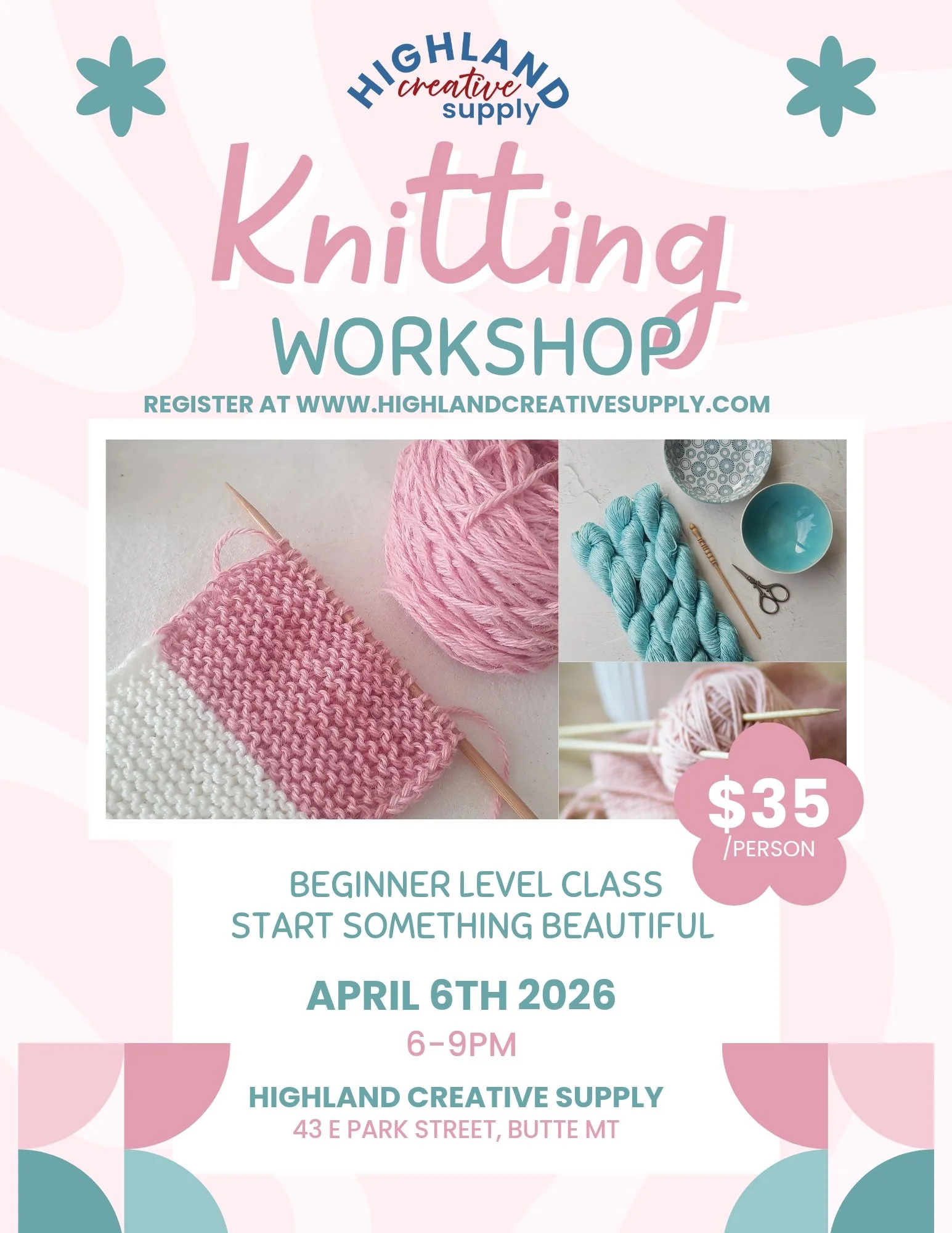 All materials provided. You will leave with needles and the beginnings of your first project.