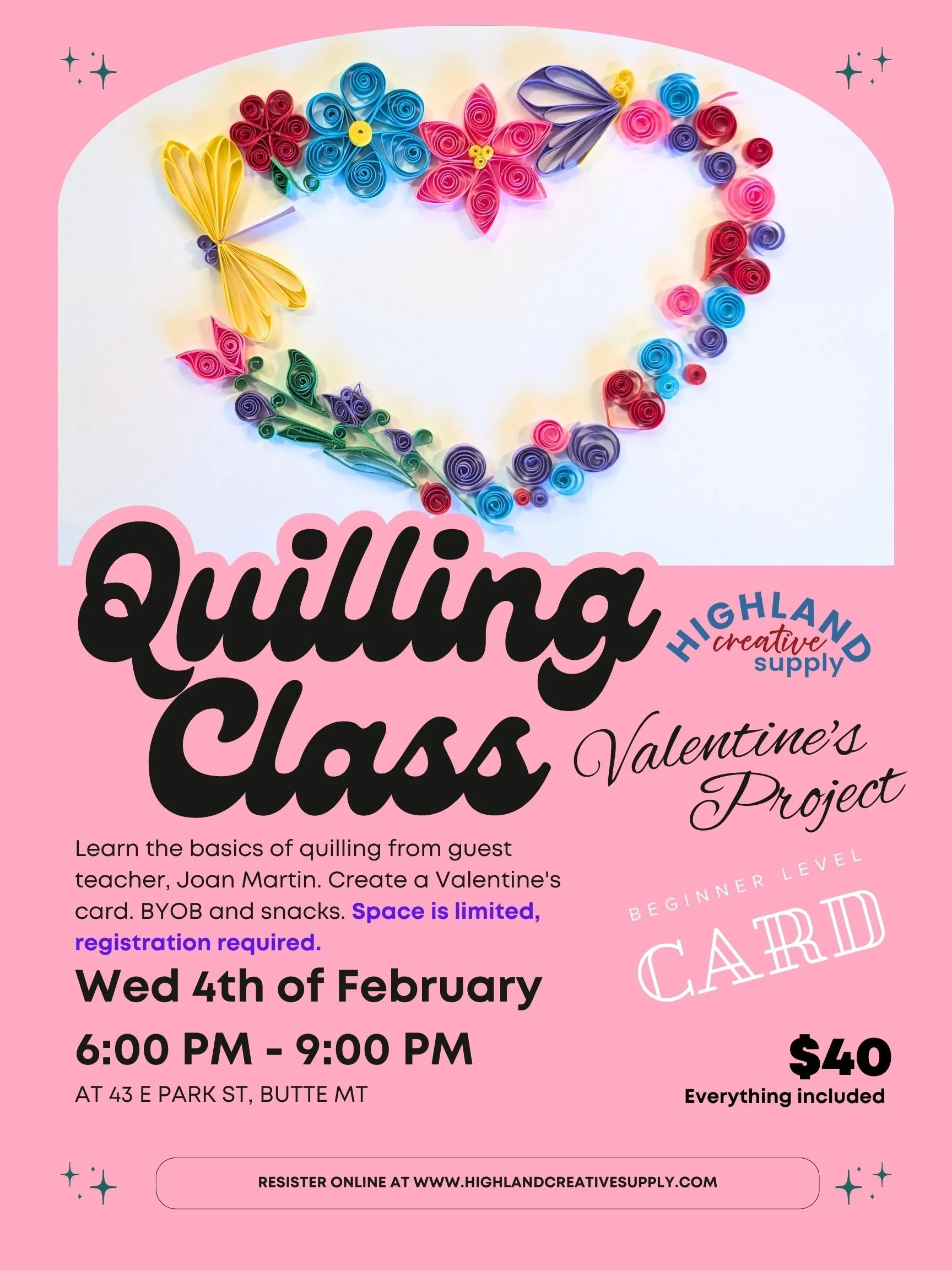 Join us for a beginner level Quilling Class taught by guest instructor, Joan Martin.