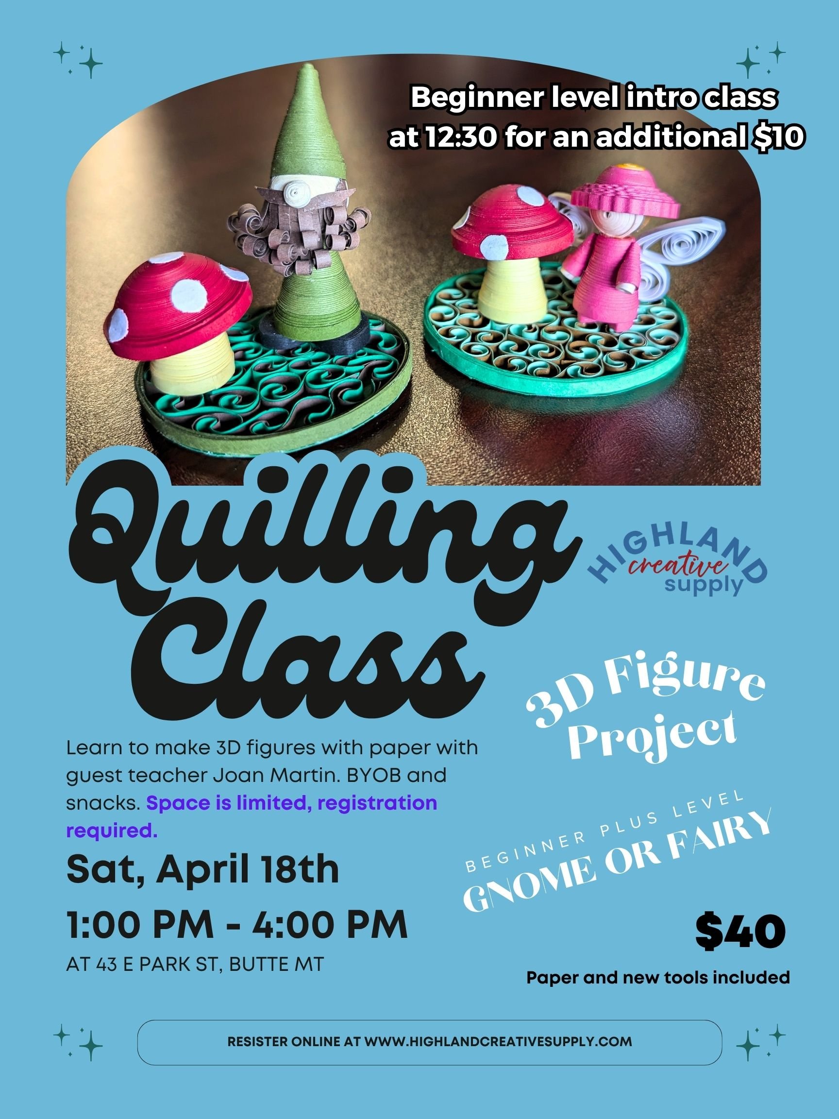 Join guest teacher Joan Martin for this 3D figure Quilling class. You will learn the techniques needed to create all sorts of adorable 3D paper objects. Choose between the gnome or the fairy for your project in class.